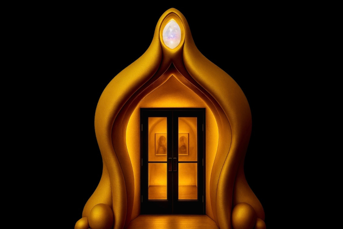 At the heart of ICON: The Mother Key stands a radiant, mandorla-shaped threshold—a sculptural yoni of gold and shadow, form and feeling. It is not simply to be seen. It is to be entered.
